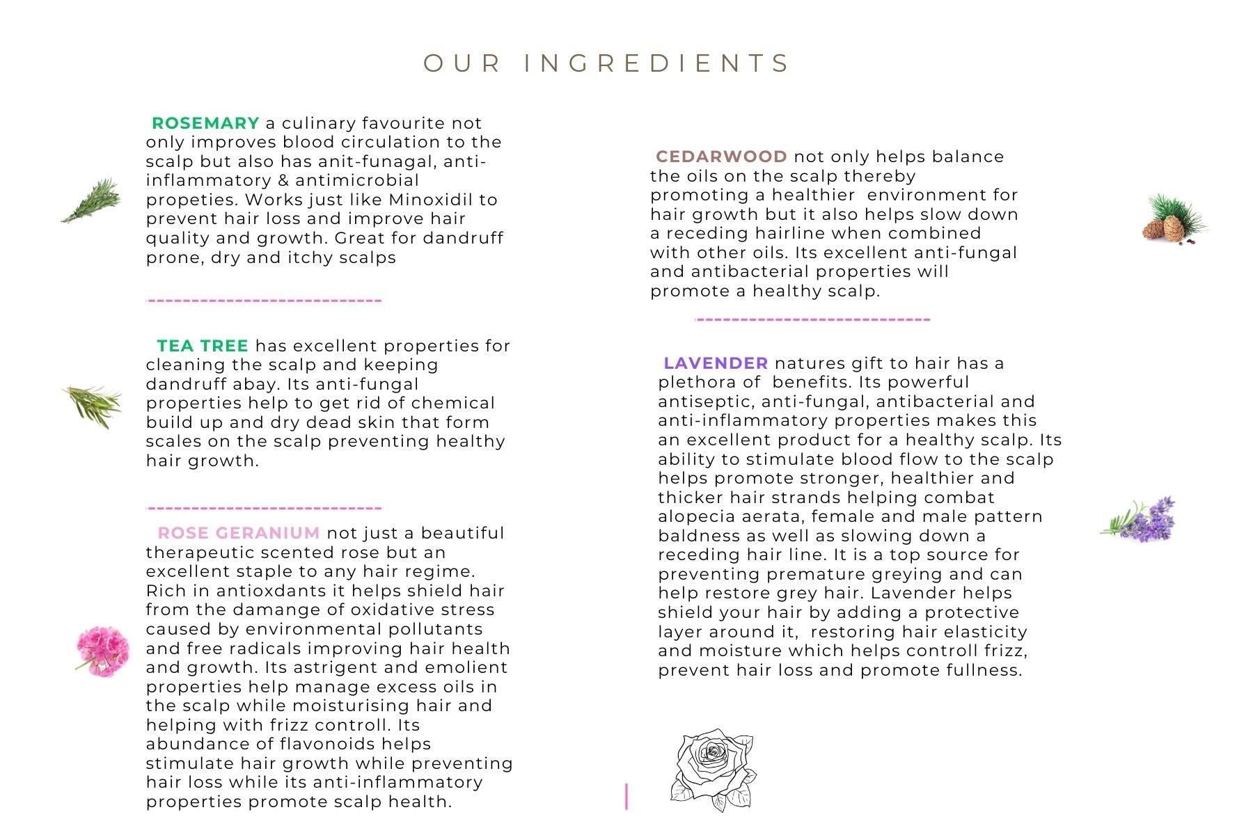 Macademia Oil, Sweet Almond Oil, Apricot Kernel Oil, Grapeseed Oil, Argan Oil, Lavender Essential Oil, Rosemary Essential Oil, Tea Tree Essential Oil, Cedarwood Essential Oil. Amla extract, Fenugreek Seed extract, Pumpkin Seed Extract, Clove extract.